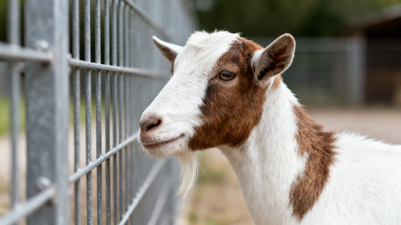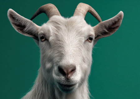 Side profile of a healthy brown and white goat presents its gentle expression, highlighting the distinctive patterns and color contrast against a teal backdrop.