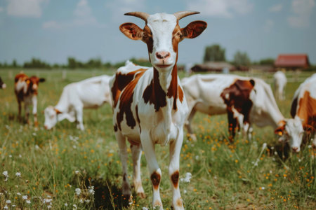Cow goat pasture in a field ecological local farm no cruelty animal safety happiness herd flock milk eco environment sustainability humanity agriculture green forest meadows mountains grass land