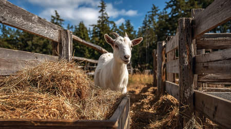 A charming goat stands playfully on hay bales in a picturesque farmyard. This serene scene captures the essence of rural life, emphasizing the beauty of farm animals in their natural habitat.