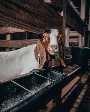 A domestic goat of the Anglo-Nubian breed in the summer in a pen.