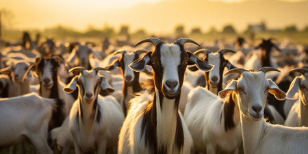 a photo of a goat ranch for sale or rent, captured in a style that incorporates lens flare and a realistic portrayal of light and shadow. the image showcases a joyful and optimistic atmosphere, with strong facial expressions of the goats. the use of tilt shift adds an emotive expression to the scene, creating a petcore aesthetic. ai generated