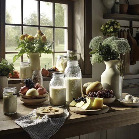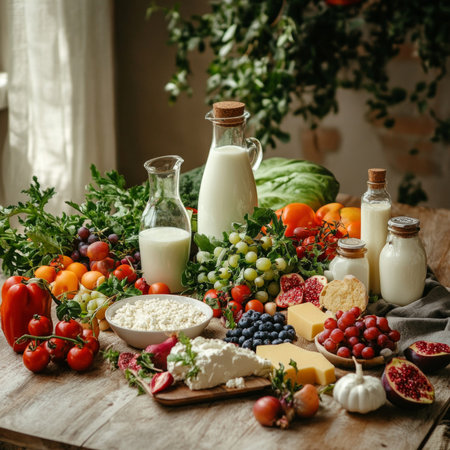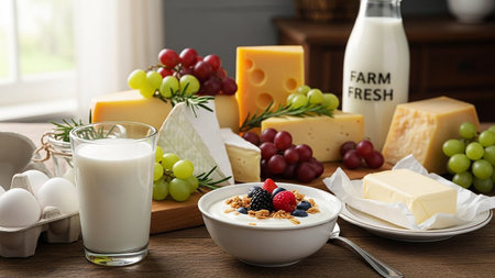 Table showing assortment of dairy products and fruits including cheese, milk, yogurt, and grapes keywords: dairy, cheese, milk, yogurt, butter,...