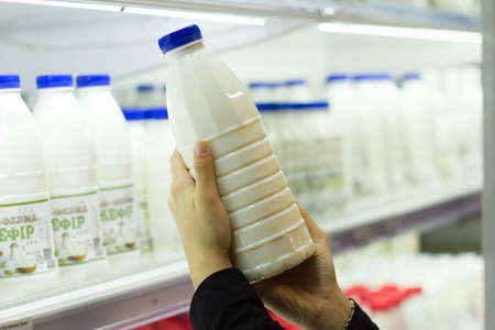 Womans hand holding milk bottle in supermarket. Man shopping milk in grocery store. Man checks product expiration date before buying it. Close-up.