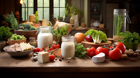 Fresh dairy products on a wooden table in the kitchen. Rustic style.