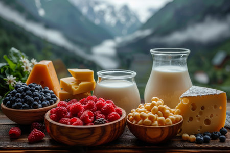 Delightful dairy display assorted cheeses and milk on a lush green meadow amidst majestic mountains