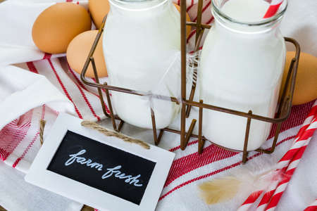 Fresh farm milk in glass jars and eggs on wood table
