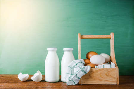 Close up of bottles of healthy milk, eggs and cheese on the table