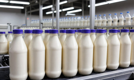 Bottles of milk move along a conveyor belt in a factory