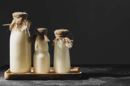 Various bottles of milk on grey concrete background