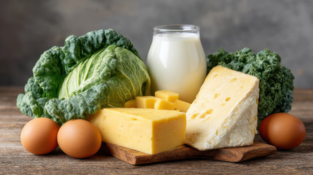 A vibrant assortment of fresh foods showcasing Vitamin K2-rich ingredients like cheese, eggs, milk, and green vegetables arranged on a rustic wooden table.