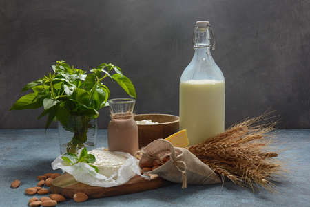 Almond milk in glass bottles with almond nuts on background. Vegan diary concept. Shavuot Jewish holiday food concept - dairy products and wheat , copy space