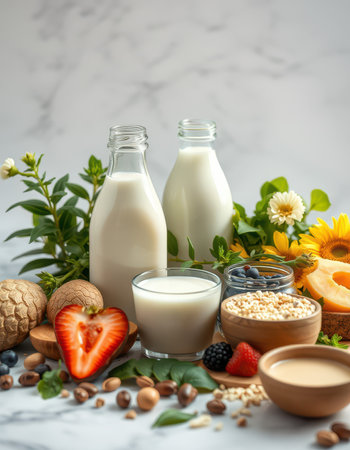 Two glass bottles of plant-based milk sit alongside a glass of milk various fruits nuts and grains