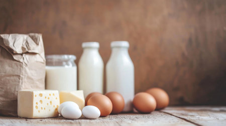 Assorted dairy products including milk bottles, cheese, and eggs placed on a rustic wooden surface, showcasing a simple and natural kitchen setup.