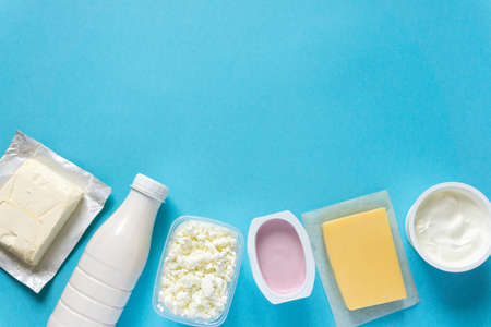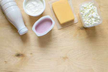Flat lay of dairy products. Milk, curd, sour cream, cheese and yogurt on wooden background, copyspace
