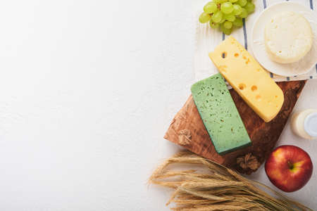 Shavuot jewish holiday celebration. Milk and cheese, ripe wheat and fruits, cream. Dairy products over white wooden background. Shavuot concept. top view. Mock up.
