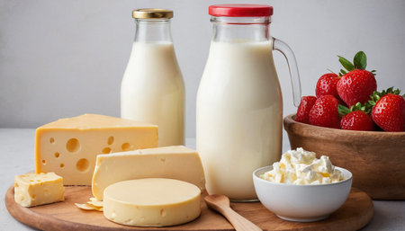 Milk products on a wooden board with strawberries and cheese on a gray background