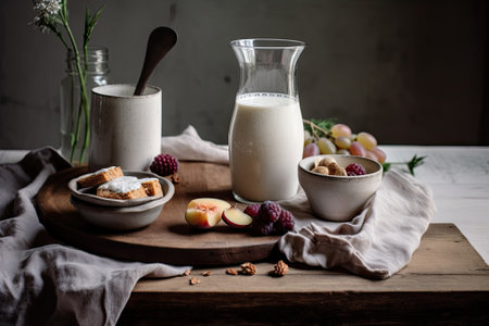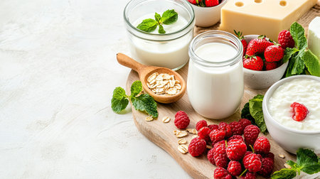 A delightful arrangement of fresh dairy products, berries, and oats on a rustic board. Perfect for healthy recipes, breakfast ideas, or snack inspiration.
