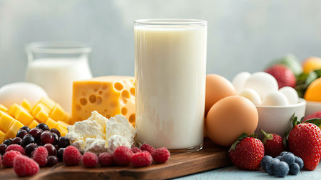 A selection of dairy products such as milk, cheese, and eggs displayed on a wooden board, with a glass of milk and colorful fruits, highlighting nutritious options for kids