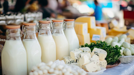 Assorted dairy products from cheese to milk at an open-air market.