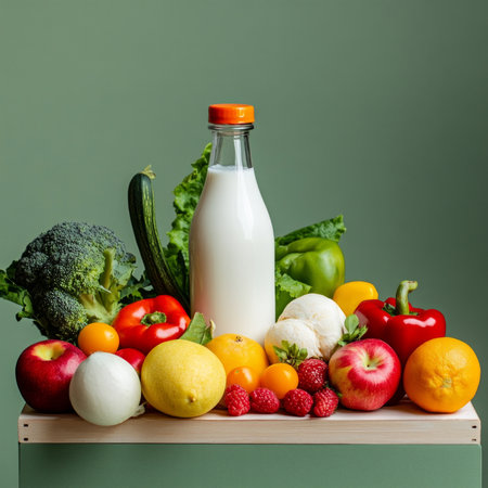 Fresh fruits and vegetables with milk bottle on wooden table.