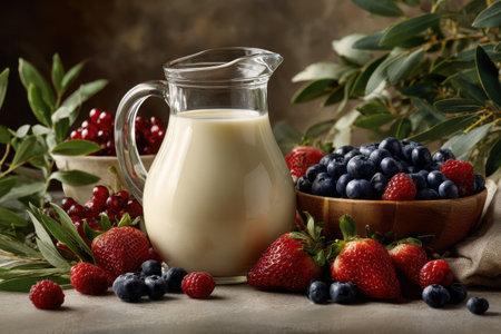 A glass pitcher filled with fresh milk sits among vibrant strawberries, blueberries, and raspberries, surrounded by lush green leaves for a refreshing display.