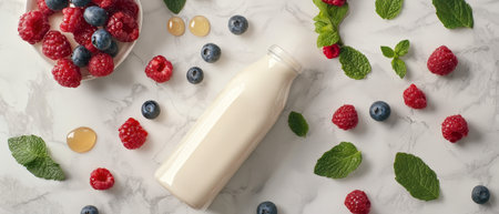 A refreshing bottle of probiotic yogurt with raspberries, blueberries, mint leaves, and honey on a marble background. Healthy gut-friendly beverage concept with fresh ingredients.