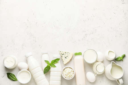 Different dairy products on light background