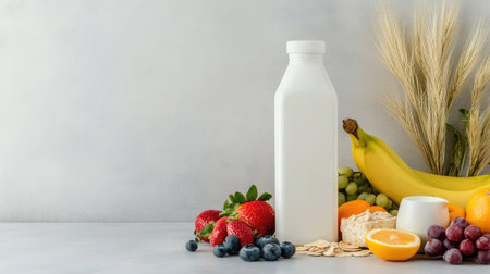 White milk carton without branding placed beside fruits and breakfast items