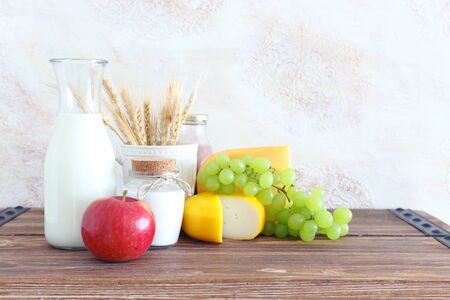 Photo of dairy products over wooden table. Symbols of jewish holiday - Shavuot