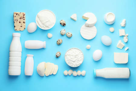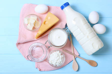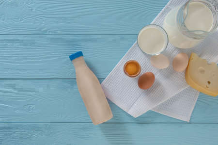 dairy products with cheese and eggs on a blue wooden background, top view. healthy eating concept