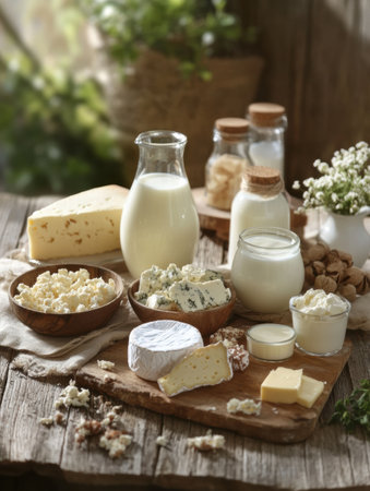 The rustic wooden table is adorned with various dairy products, including creamy cheeses, milk, and rich butter, creating a warm atmosphere.