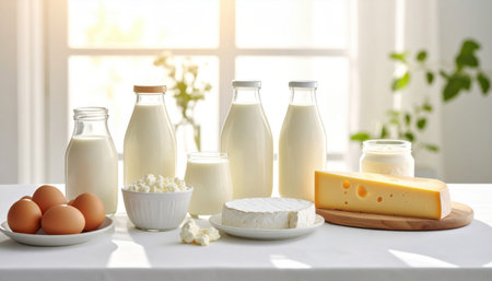 Dairy products and eggs arranged in a bright kitchen represent healthy eating, farm-to-table trends, or organic food lifestyle with breakfast mood.