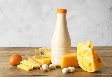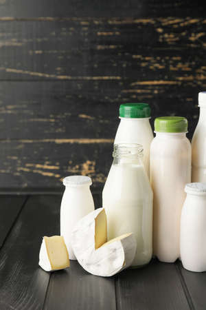 Fresh dairy products on a rustic wooden table. Selective focus.