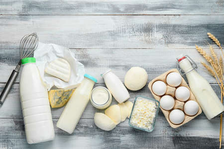 Dairy food products and eggs on the white wooden table. Shallow dof.
