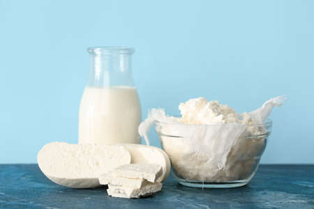 a collection of milk and yogurt cheese, light gray and blue wood background
