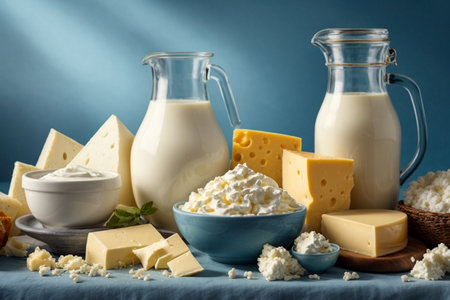 A dark background with a variety of dairy products and snacks arranged in a visually appealing manner