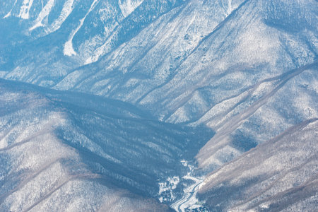 Aerial image from the top of snowy mountain pines in the middle of the winter.