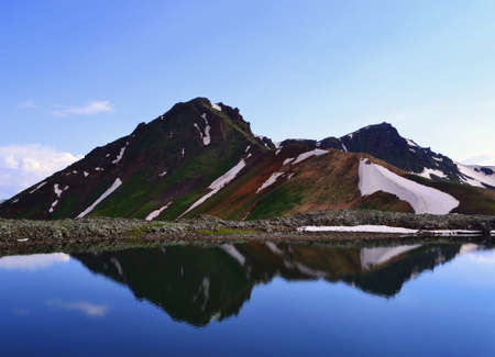 Summer landscape of Kamchatka Peninsula: beautiful view of Mountain Range Vachkazhets, mountain lake and clouds in blue sky on sunny day. Eurasia, Far East, Russia, Kamchatsky Region.