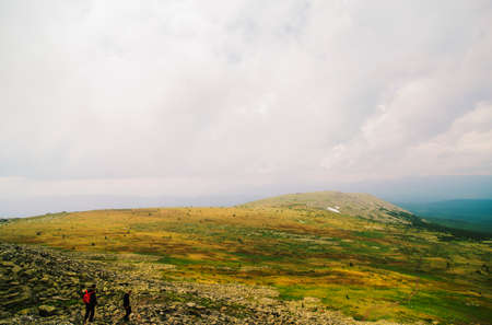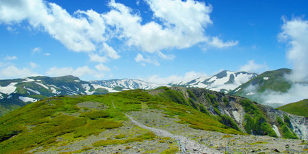 Hiking trail through alpine meadow. Beautiful landscape in the summer time. Kamchatka peninsula, Russia.