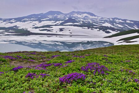 View of volcanoes with snow and hills with green grass in Kamchatka, Russia. Beautiful summer landscape