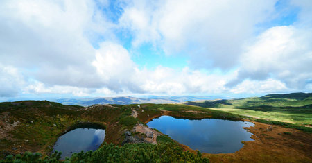 Shiretoko Goko Five Lakes in Shiretoko National Park. Rolling mountain range and wetland in high latitude country springtime. Tourists can walk on the elevated wooden boardwalk. Shari, Hokkaido, Japan