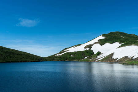 The Fifth Lake of Shiretoko Goko Five Lakes area. Natural beauty scenery, rolling mountain range and woodland in high latitude country springtime. Shiretoko National Park. Town Shari, Hokkaido, Japan