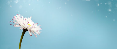 Beautiful Blue Nature Background with White Daisy Flower and Water Drops.