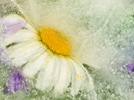 beautiful delicate fragile ice abstraction with organic chamomile flower frozen in clean clear water and a lot of air bubbles in the ice