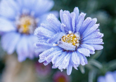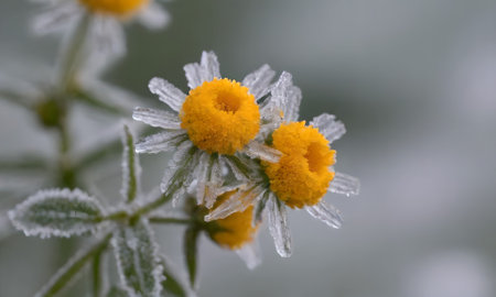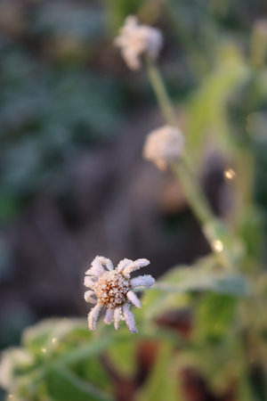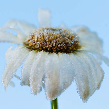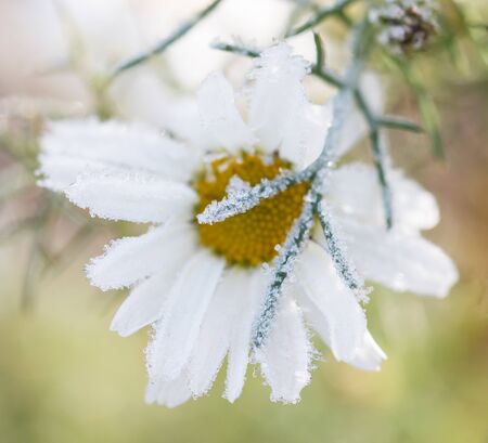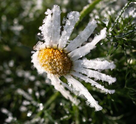 Frozen chamomile flower covered with morning frost.