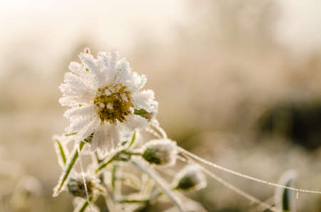 Autumn flower with iniem ice in the rays of dawn