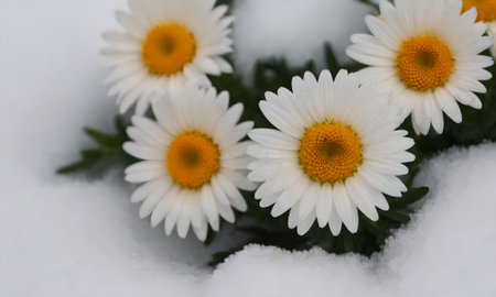 Close-up of white and yellow daisies in the snow