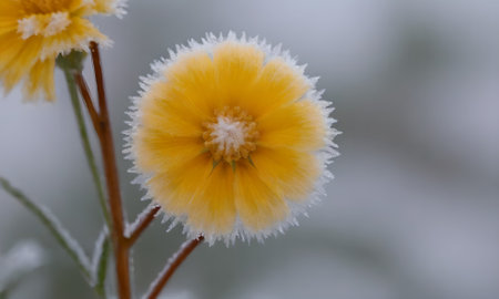 Close up of a yellow flower with ice crystals in the background.