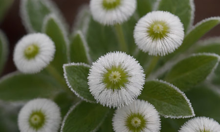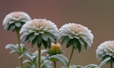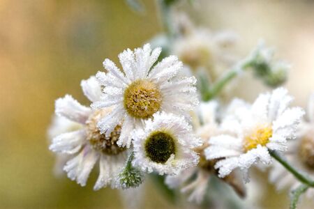 Close-up of the flowers of a camomile covered with hoarfrost