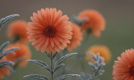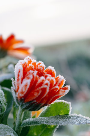 Close-up of orange flowers covered with hoarfrost. Winter background